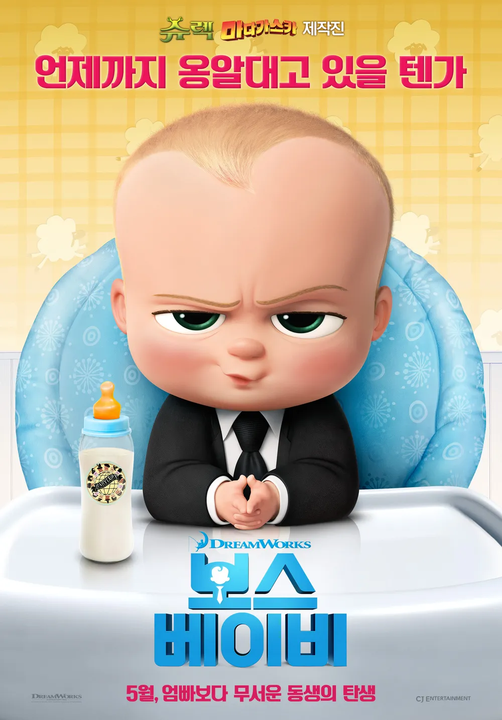 팀의 세상은 새 아기가 집에 도착하자 뒤집어지고, 그의 부모는 양복을 입고 서류 가방을 들고 있는 새 동생에게 그를 소개합니다. 아기는 자신을 테오도르 린지 템플턴이라고 소개하지만, 자신은 '보스 베이비'(알렉 볼드윈)라고 불리기를 고집합니다. 보스베이비는 일반적인 아기들과 달리 총명하고 어른스러운 말투와 비밀임무를 수행하고 있습니다.